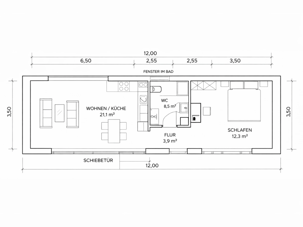 Mit seinen 12,00 x 4,00 m bietet das LE MicroHouse eine durchdachte Aufteilung mit gut nutzbaren Wohnzonen. Der Grundriss sieht einen offenen Bereich für Wohnen / Küche, einen Flur, ein WC-/Badsegment sowie einen separaten Bereich Schlafen vor. Gerade die 4,00 m Breite sorgt dabei für ein Wohngefühl, das deutlich großzügiger wirkt, als man es bei einem MicroHouse erwarten würde.