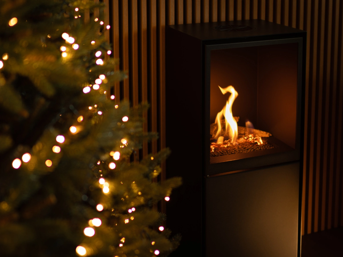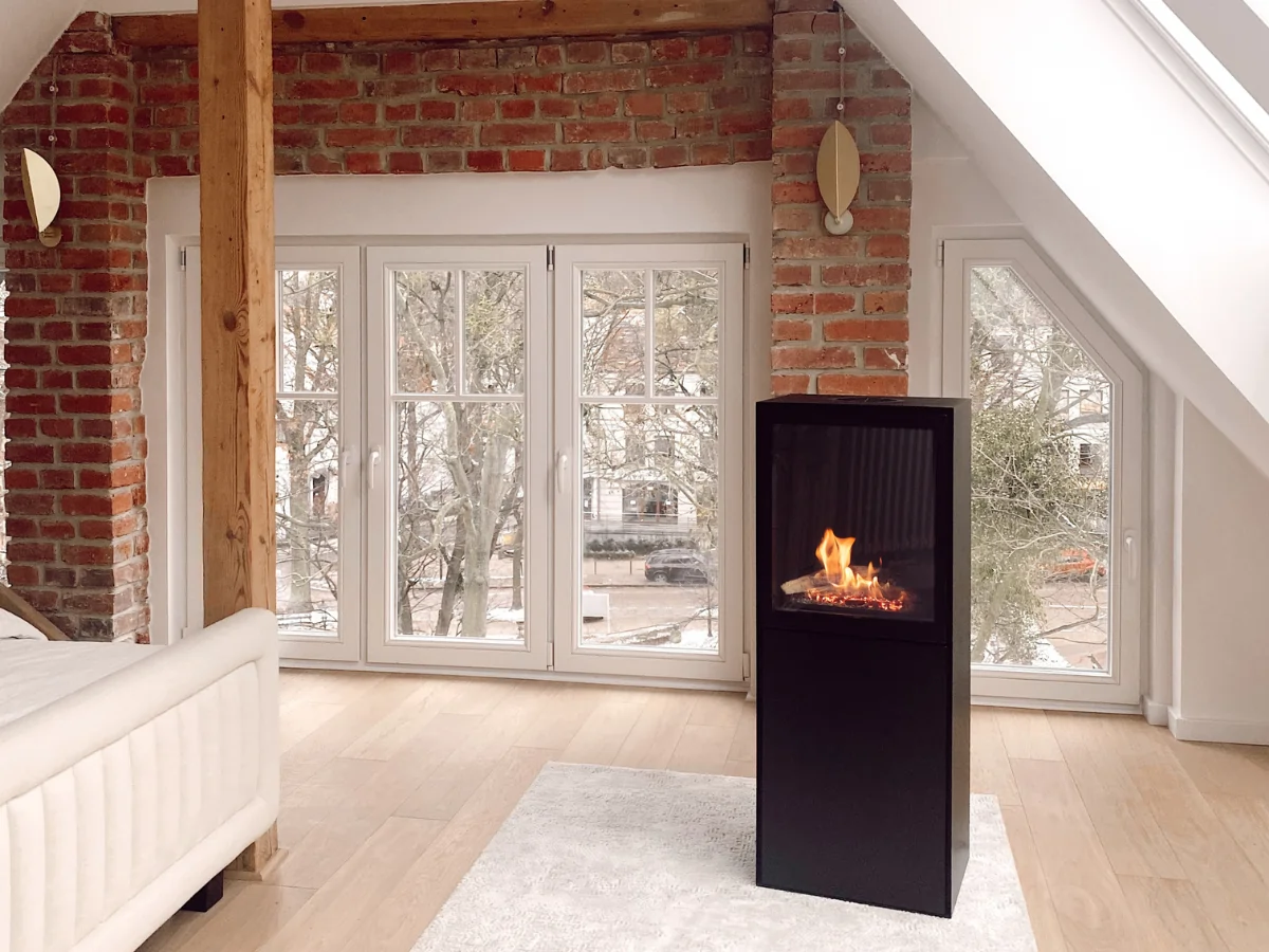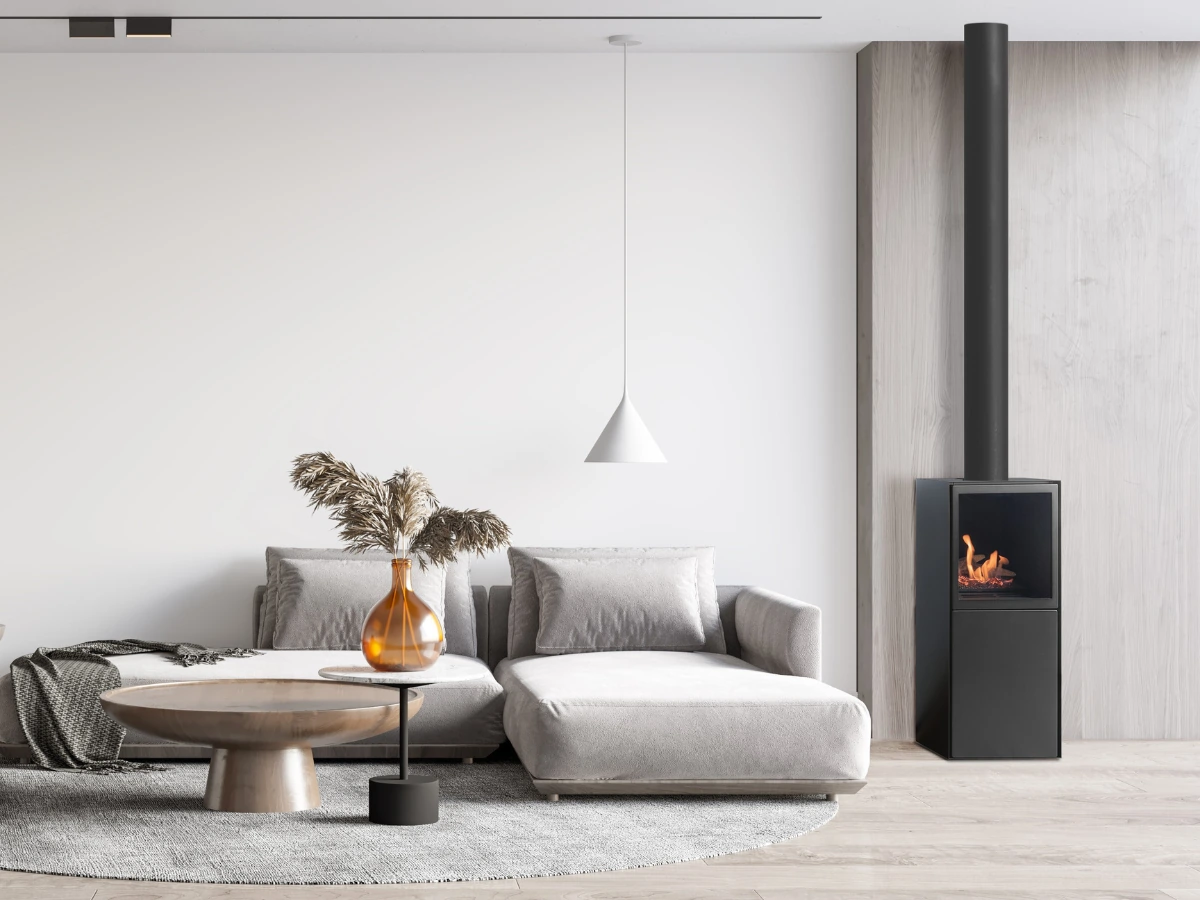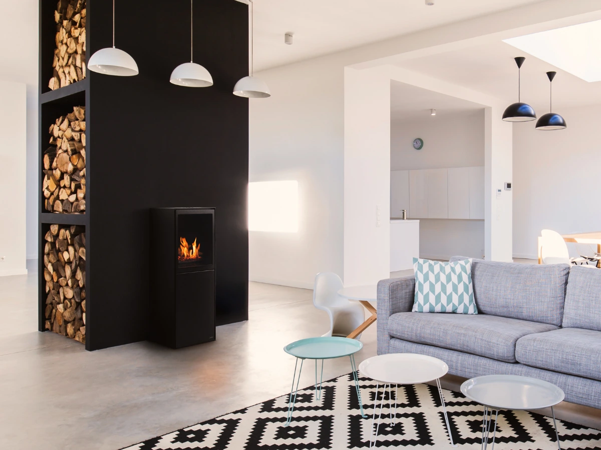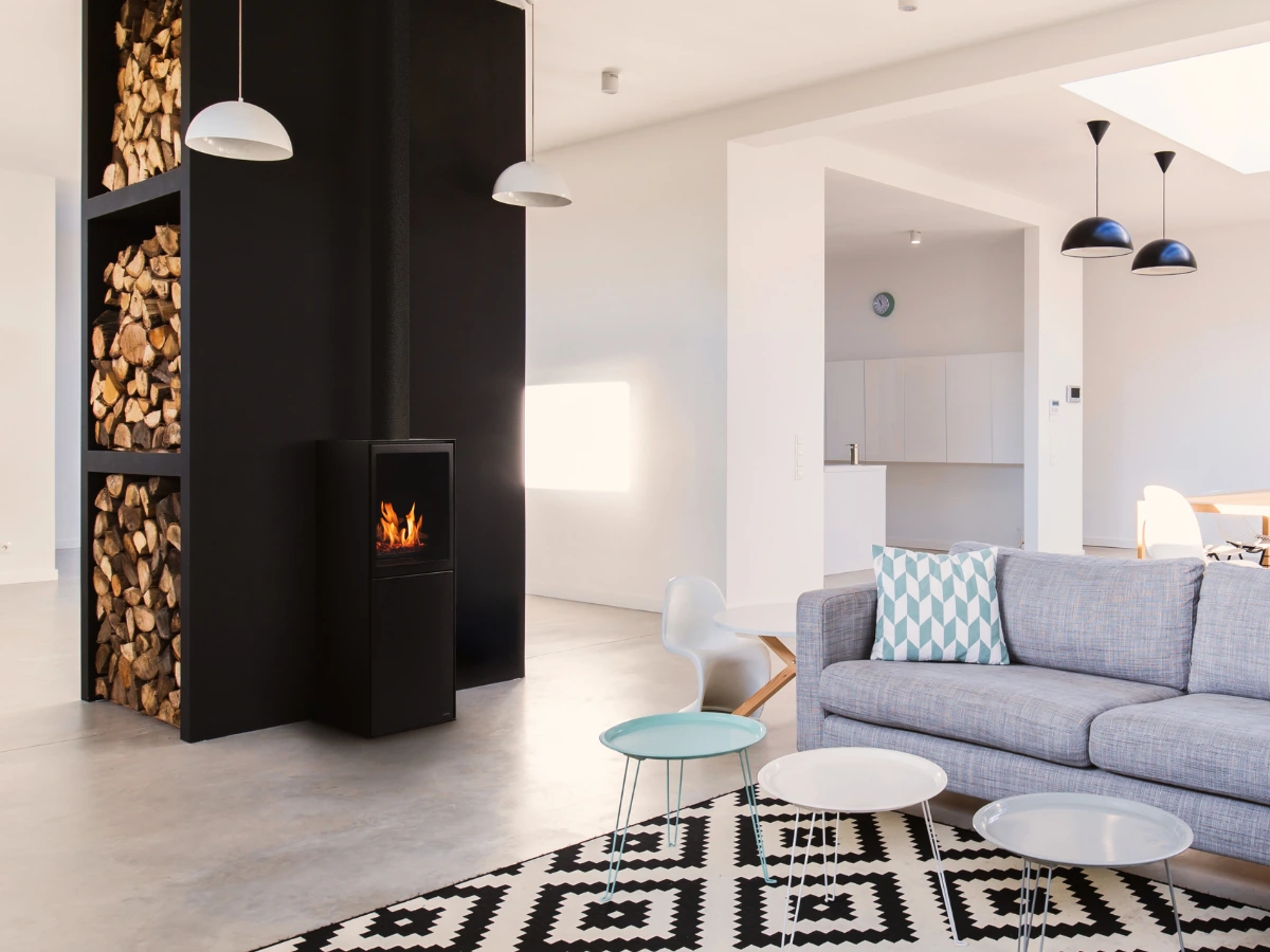 Die klare, reduzierte Form, die schwarze pulverbeschichtete Oberfläche und die geschützte Sichtflamme geben dem Scandi diesen typischen skandinavischen Kaminofen-Look. Er wirkt wie ein moderner Schwedenofen – nur ohne Holzschleppen, ohne Ruß und ohne Schornsteinpflicht. So wird der Kamin zum ruhigen, warmen Blickfang im Raum statt zu einem lauten Technikobjekt.