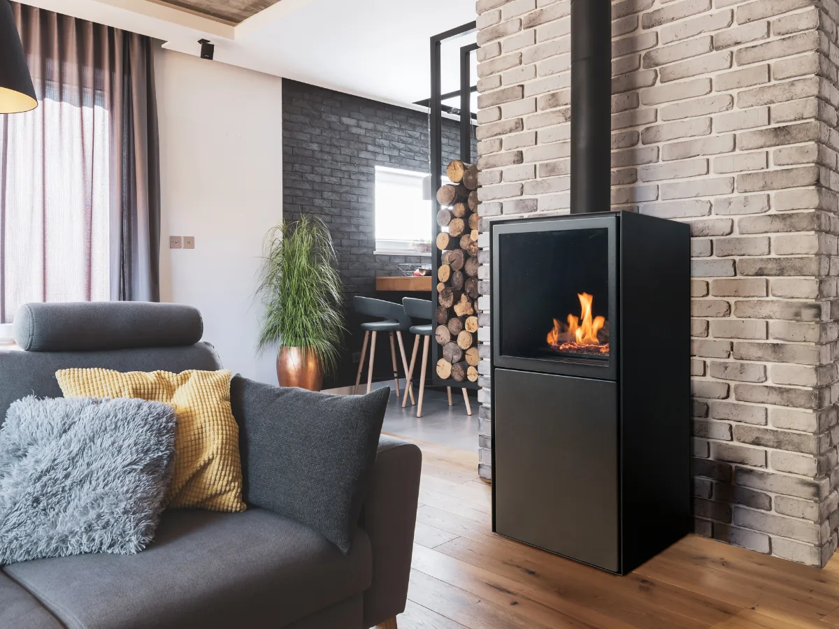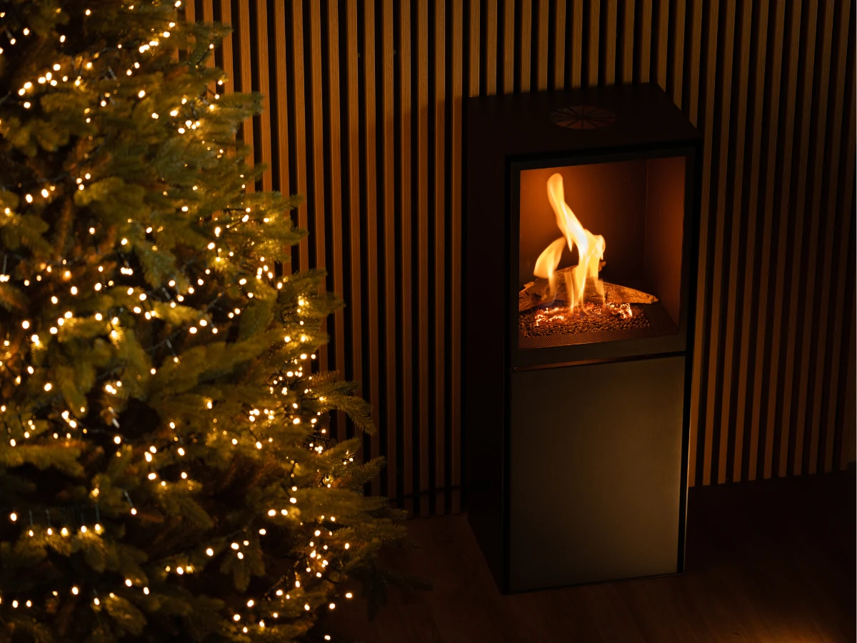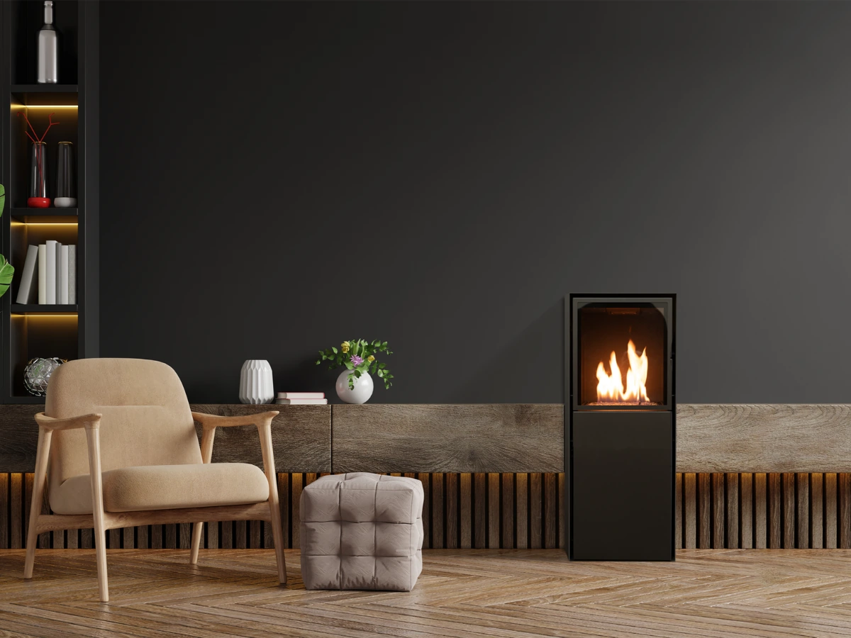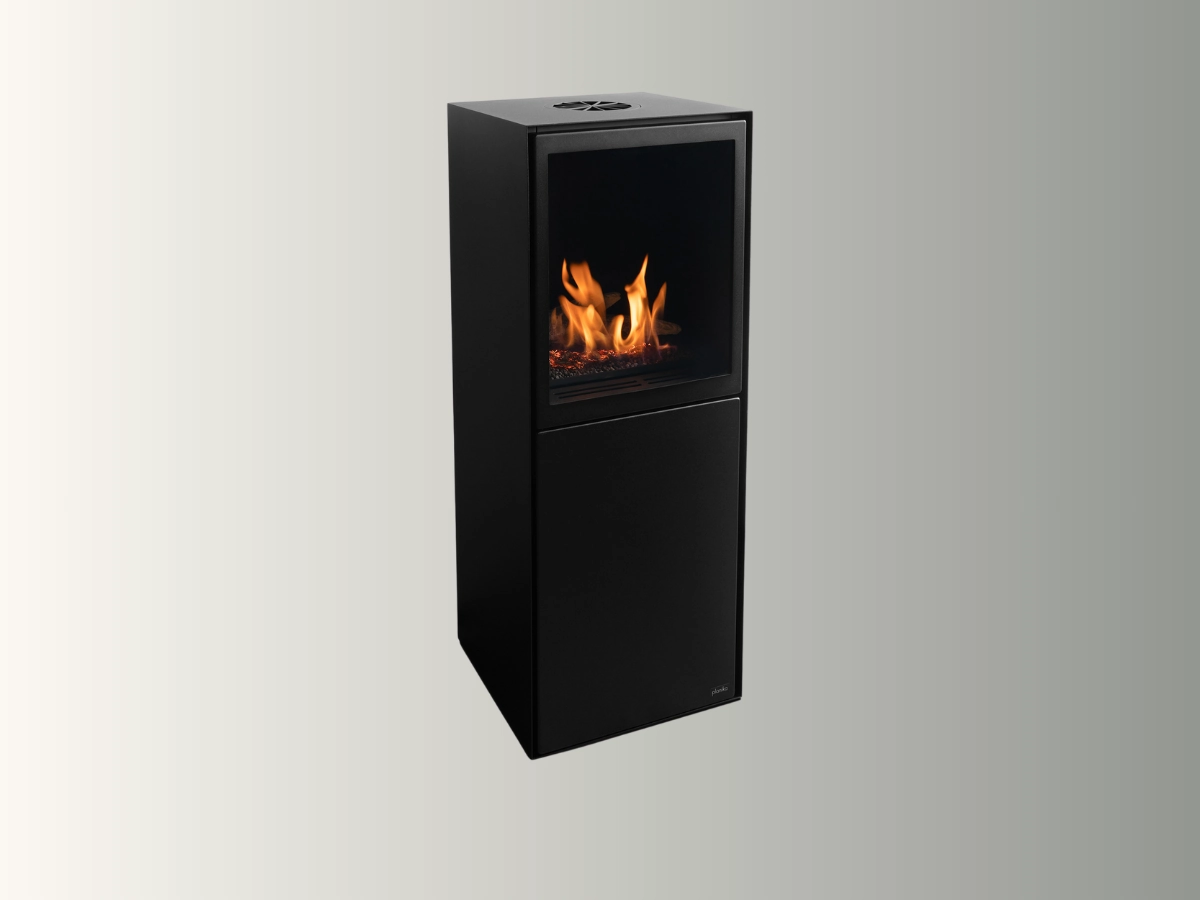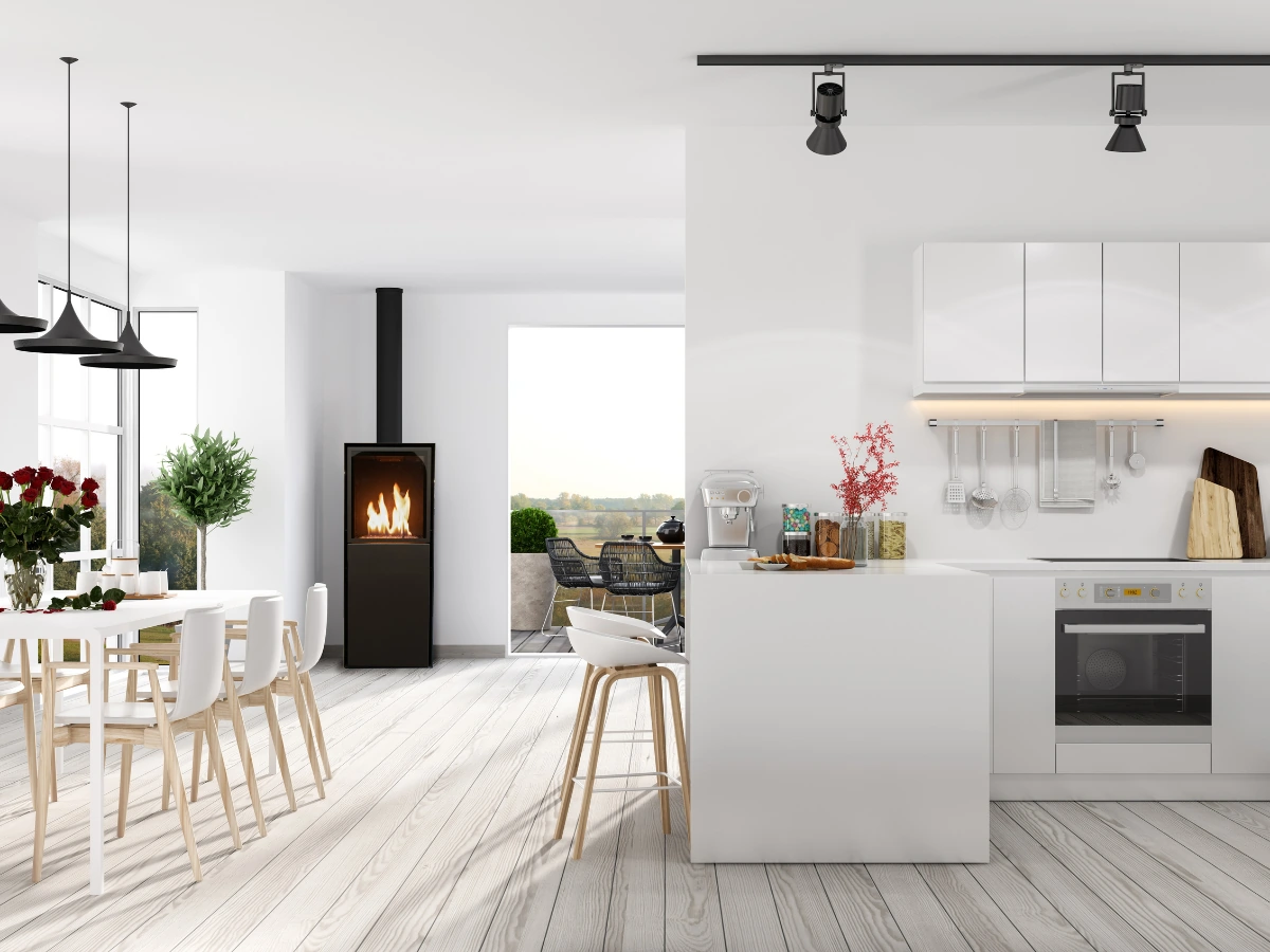 Die klare, reduzierte Form, die schwarze pulverbeschichtete Oberfläche und die geschützte Sichtflamme geben dem Scandi diesen typischen skandinavischen Kaminofen-Look. Er wirkt wie ein moderner Schwedenofen – nur ohne Holzschleppen, ohne Ruß und ohne Schornsteinpflicht. So wird der Kamin zum ruhigen, warmen Blickfang im Raum statt zu einem lauten Technikobjekt.