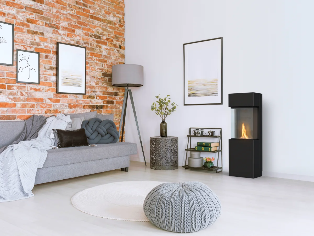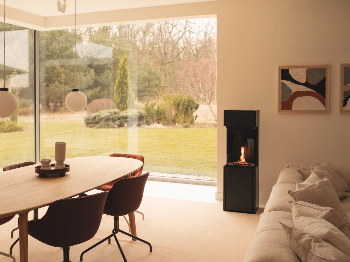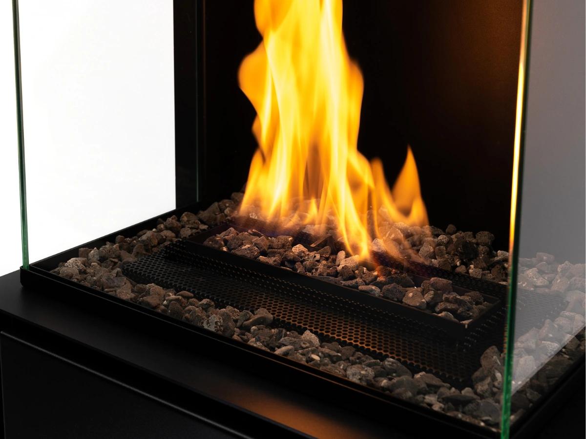 Die Flamme sitzt hinter hitzebeständigem, gehärtetem Glas. Das schützt Kinder, Haustiere und Möbel und stabilisiert gleichzeitig das Flammenbild. Durch die dreiseitige Verglasung hast du einen Panorama-Blick aufs Feuer, egal ob du auf dem Sofa oder am Esstisch sitzt.