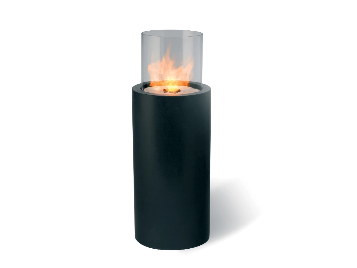 - Materialien: Polystone (Kunststein) / Betonoptik in Schwarz, Edelstahl-Brenner, zylindrisches, gehärtetes Glas