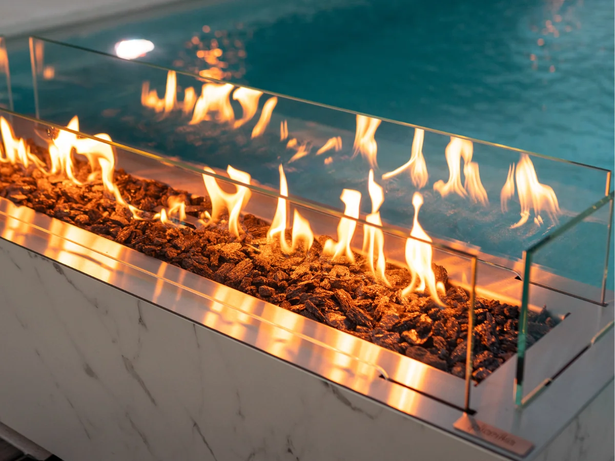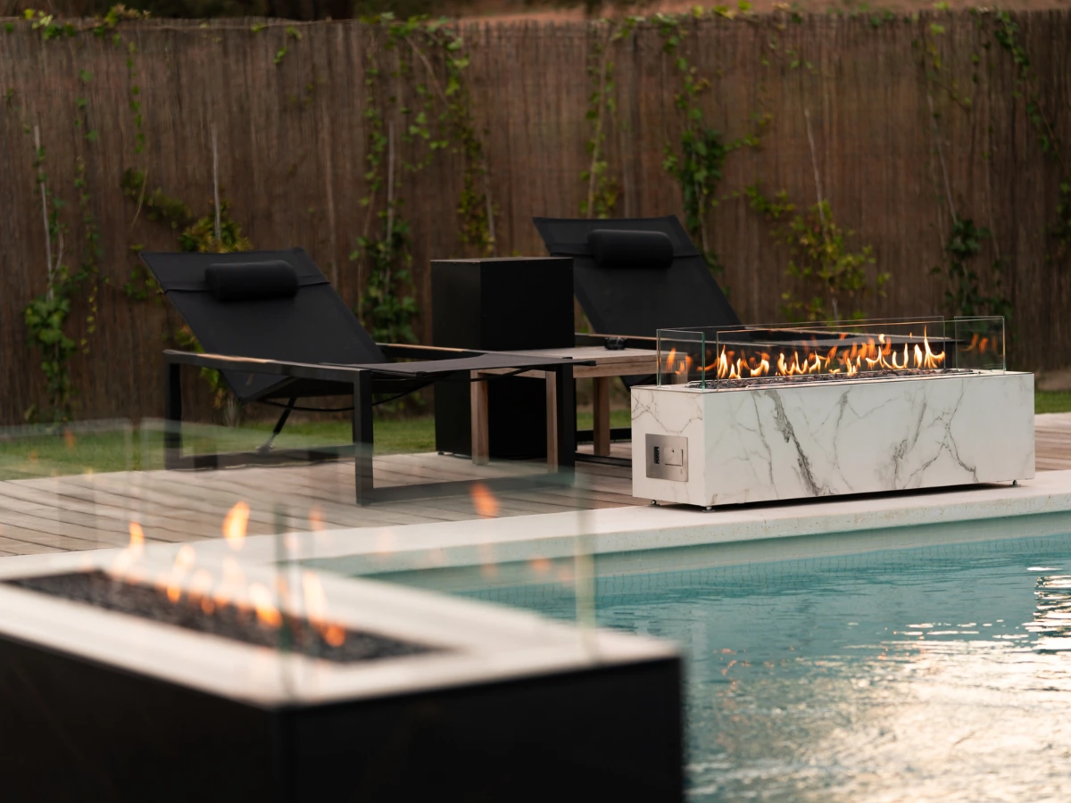 Steuerung per Fernbedienung oder via App FLA4 NET ZERO; integriertes, verdecktes Bedienfeld zeigt den Gerätestatus. Die Nachfüllpumpe ist im unteren Fach bereits eingebaut – Flasche tauschen, fertig. Die umlaufenden Scheiben schützen die Flamme zuverlässig vor Wind.