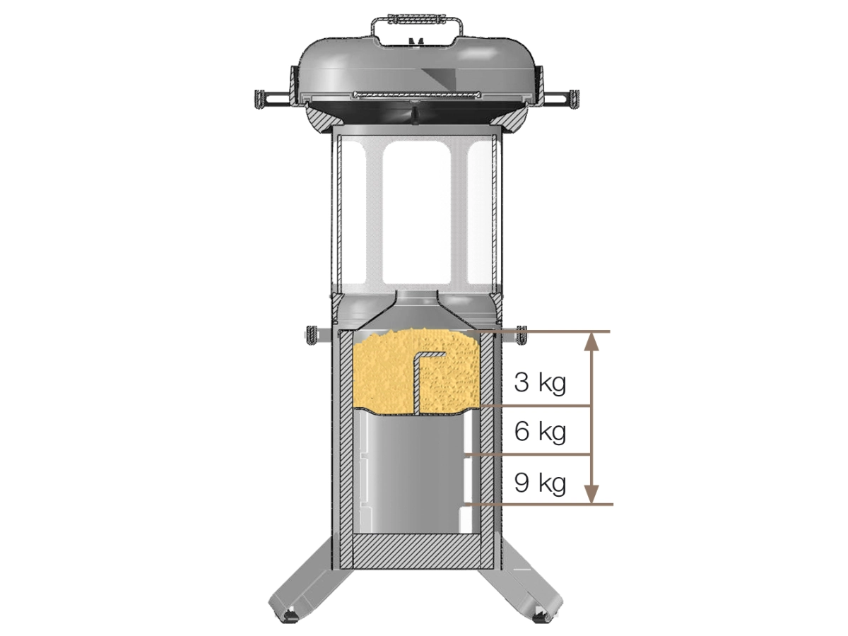 Der Pelletgrill wird mit handelsüblichen Holzpellets betrieben. Die Brennkammer wird je nach gewünschter Brenndauer mit ca. 3, 6 oder 9 kg Pellets befüllt. Die Flamme tritt aus der Brennkammer durch eine Lochabdeckung aus und steigt zentral nach oben. Über einen Schieberegler wird die Luftzufuhr eingestellt, sodass sich die Flammenintensität und damit die Grilltemperatur sehr genau über einen breiten Bereich regeln lassen. In der Praxis liegen die Brennzeiten – abhängig von Füllmenge, Schiebereinstellung und Glasaufsatz – etwa zwischen 1 und bis zu rund 4,5 Stunden.
