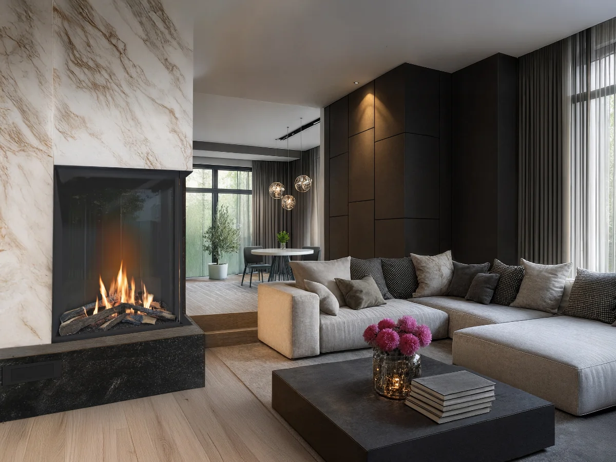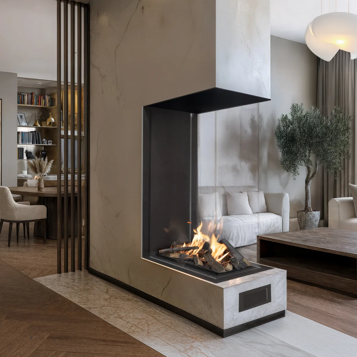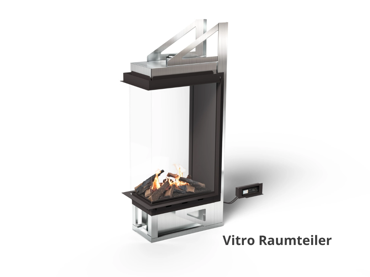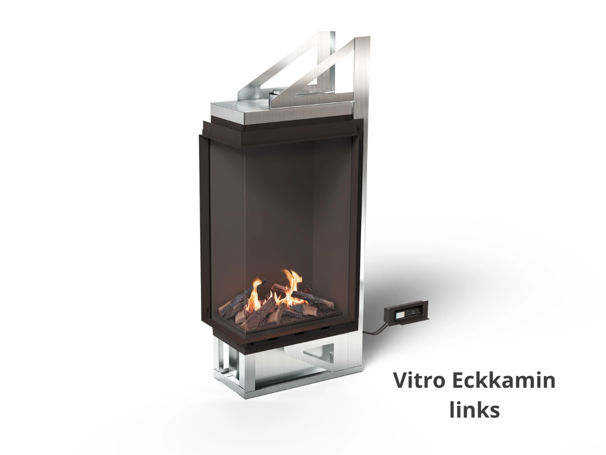 Vitro ist in drei Ausführungen erhältlich: Raumteiler (3-seitig einsehbar), Eckkamin links (Front + links sichtbar) und Eckkamin rechts (Front + rechts sichtbar). So lässt sich das Feuerbild exakt auf Wand, Ecke oder Raumteiler-Architektur abstimmen.