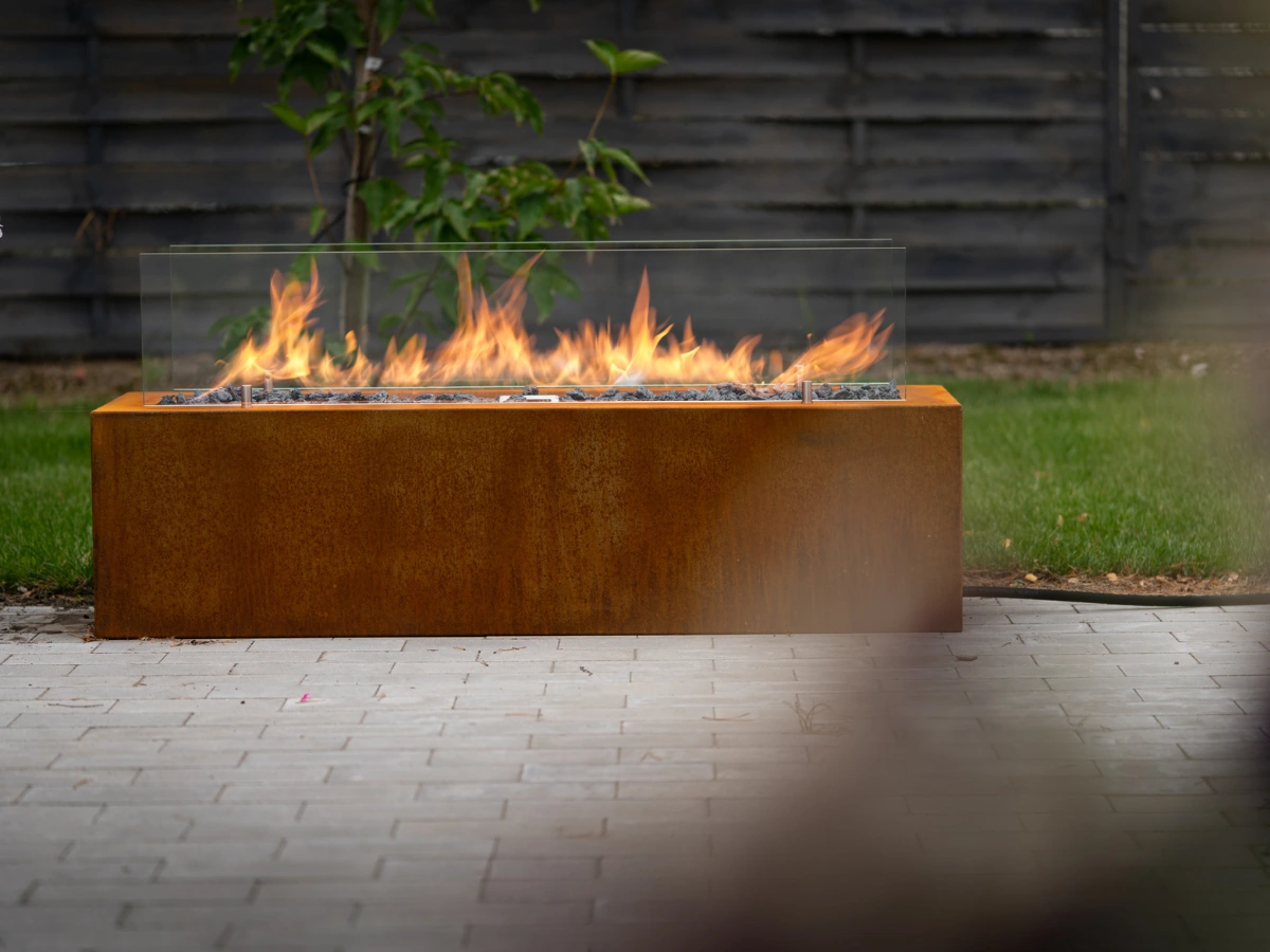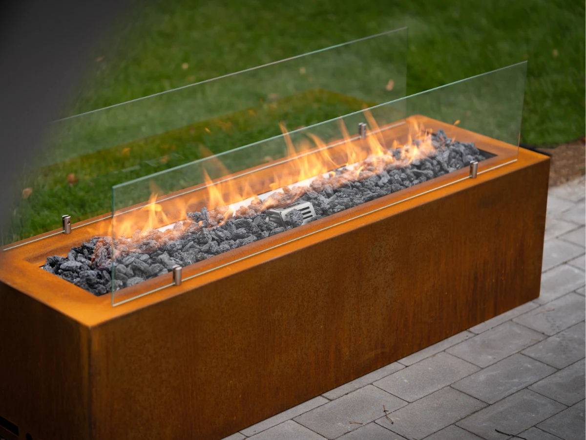 - Typ: Freistehender Outdoor-Gaskamin (lineares Feuerband)