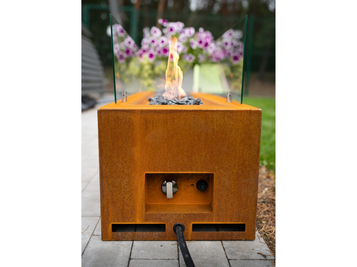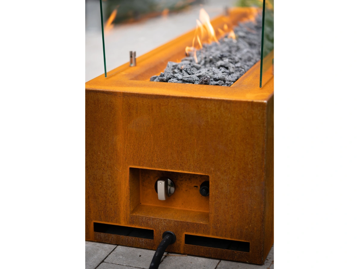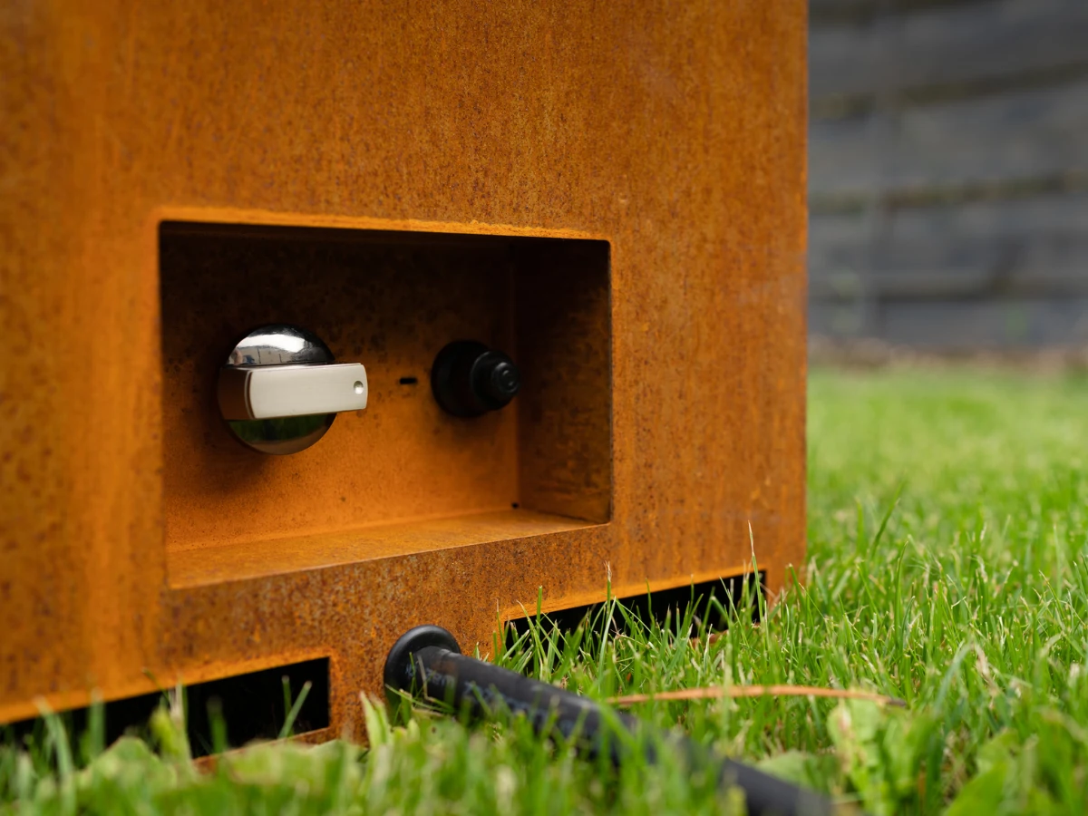 Für dauerhafte Installationen lässt sich Galio an eine Erdgasleitung anschließen. Für maximale Flexibilität kannst du ihn aber auch an eine Propan-/LPG-Flasche hängen. Für den Gästebereich gibt es passende Abdeckboxen aus Corten bzw. pulverbeschichtetem Stahl, die die Flasche elegant kaschieren. So steht keine nackte Gasflasche neben der Lounge.