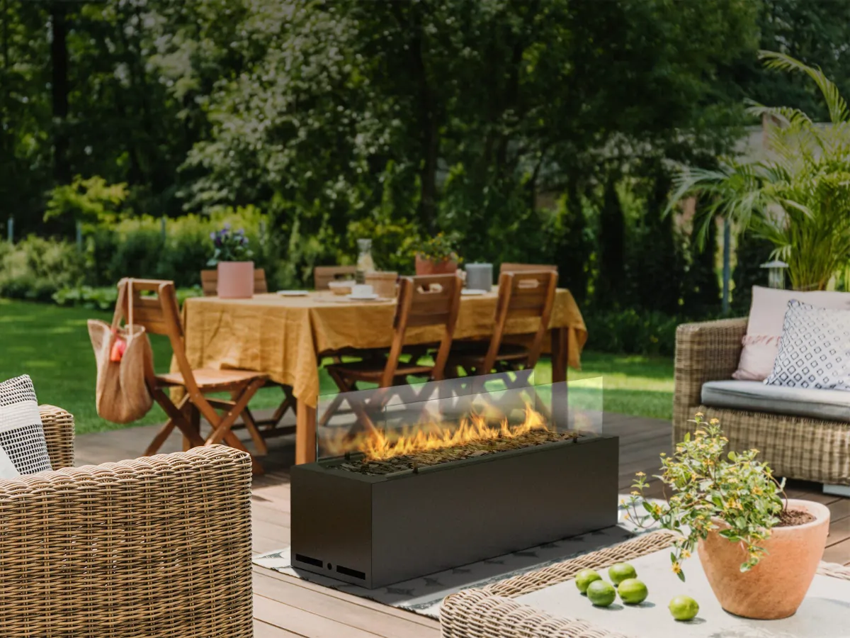 - Bauart: Freistehender Outdoor-Gaskamin (lineares „Feuerband“)