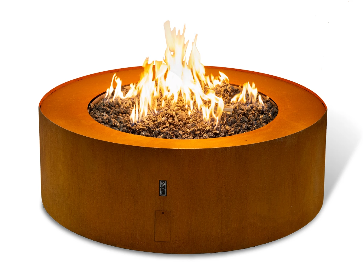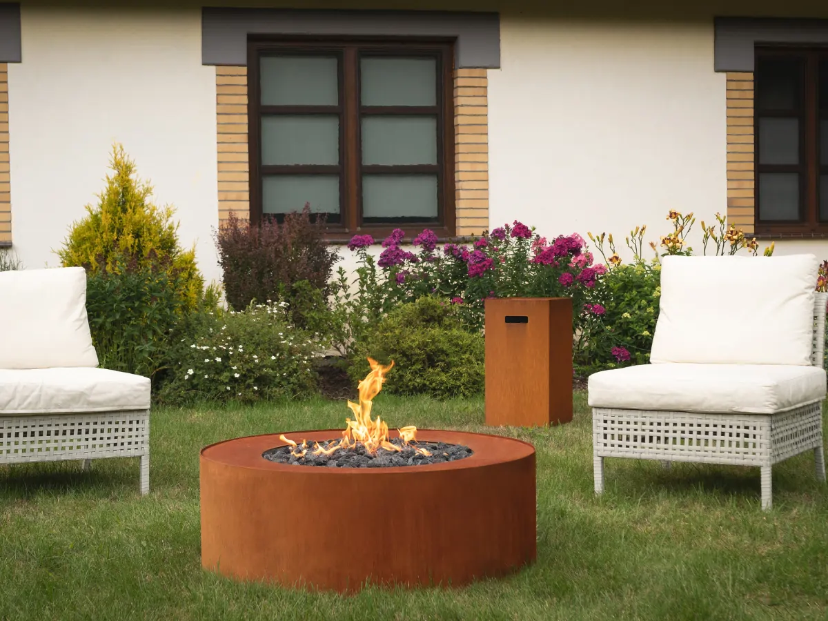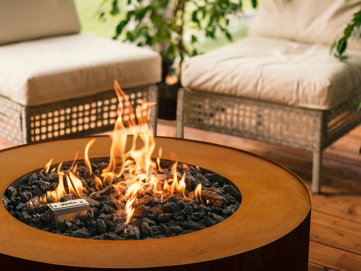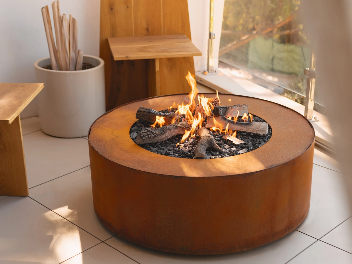 Das Gehäuse besteht aus Cortenstahl. Dieser Stahl ist für den Außeneinsatz entwickelt und bildet mit der Zeit eine warme, rostige Schutzhülle. So entsteht ein industrieller, hochwertiger Look, der gleichermaßen zu modernen Wohnterrassen wie zu professionellen Outdoor-Bereichen passt. Schwarze Dekosteine im Brennraum unterstreichen die Tiefe der Flamme.