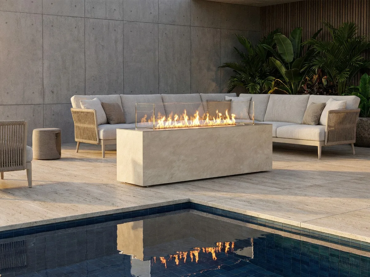 Steuerung per Fernbedienung oder via App FLA4 NET ZERO; integriertes, verdecktes Bedienfeld zeigt den Gerätestatus. Die Nachfüllpumpe ist im unteren Fach bereits eingebaut – Flasche tauschen, fertig. Die umlaufenden Scheiben schützen die Flamme zuverlässig vor Wind.