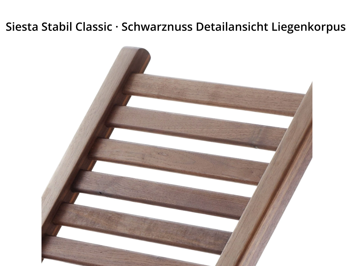 Bei der Wellnessliege Siesta Stabil ergänzen sich perfekt verarbeiteter Edelstahl und ausdruckstarkes Massivholz in ergonomischer Form - damit wird Ihr Ruhebereich zur harmonischen Umgebung. Im Gegensatz zur Siesta Classic ist der Liegenkorpus nicht schwingend, sondern fix am Untergestell montiert. Sie können jede gewünschte Liege- oder Sitzposition mit der 5-fach verstellbaren Rückenlehne erreichen - ob hochgestellte Lehne zum Lesen oder flach zurückgelegt.